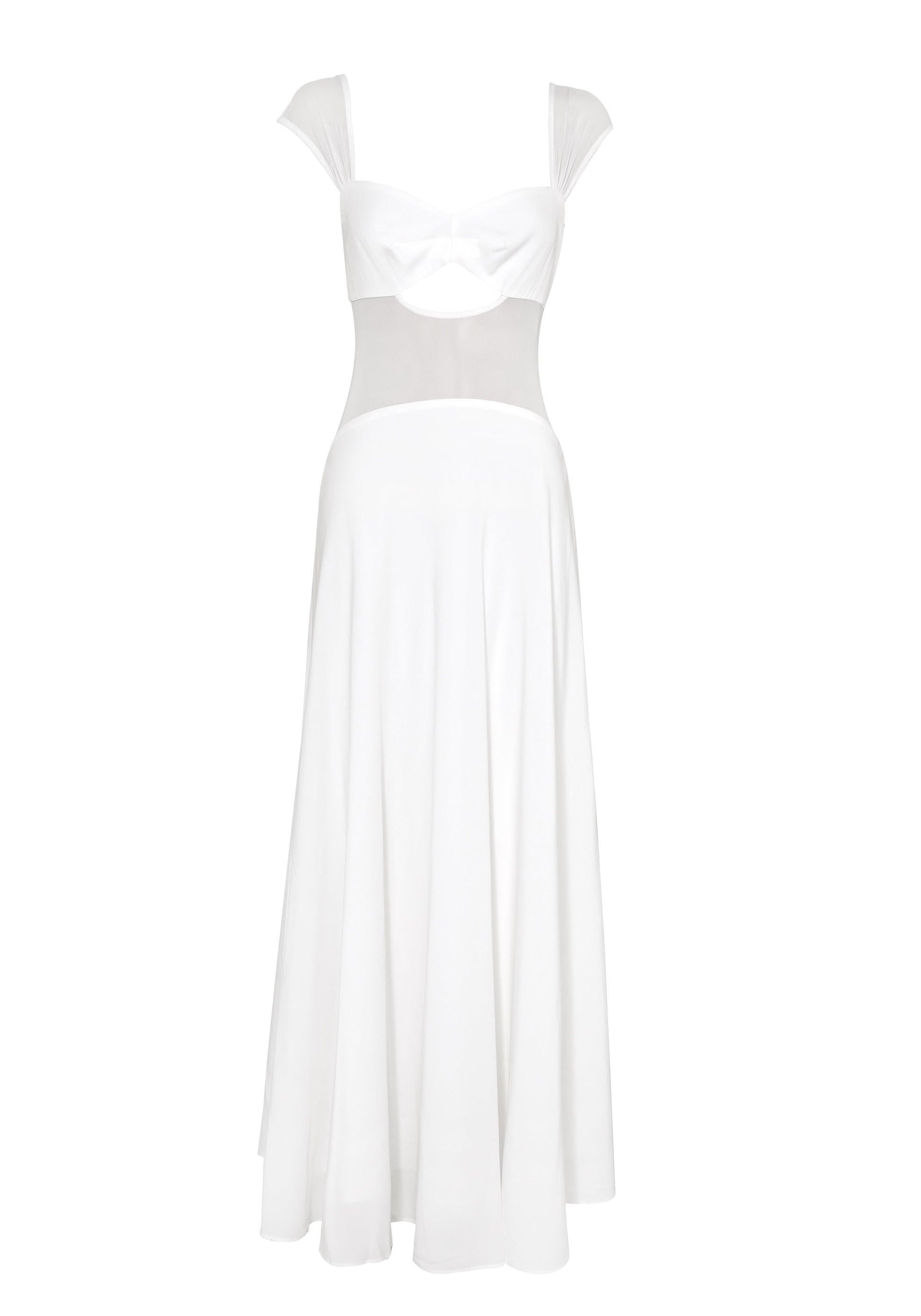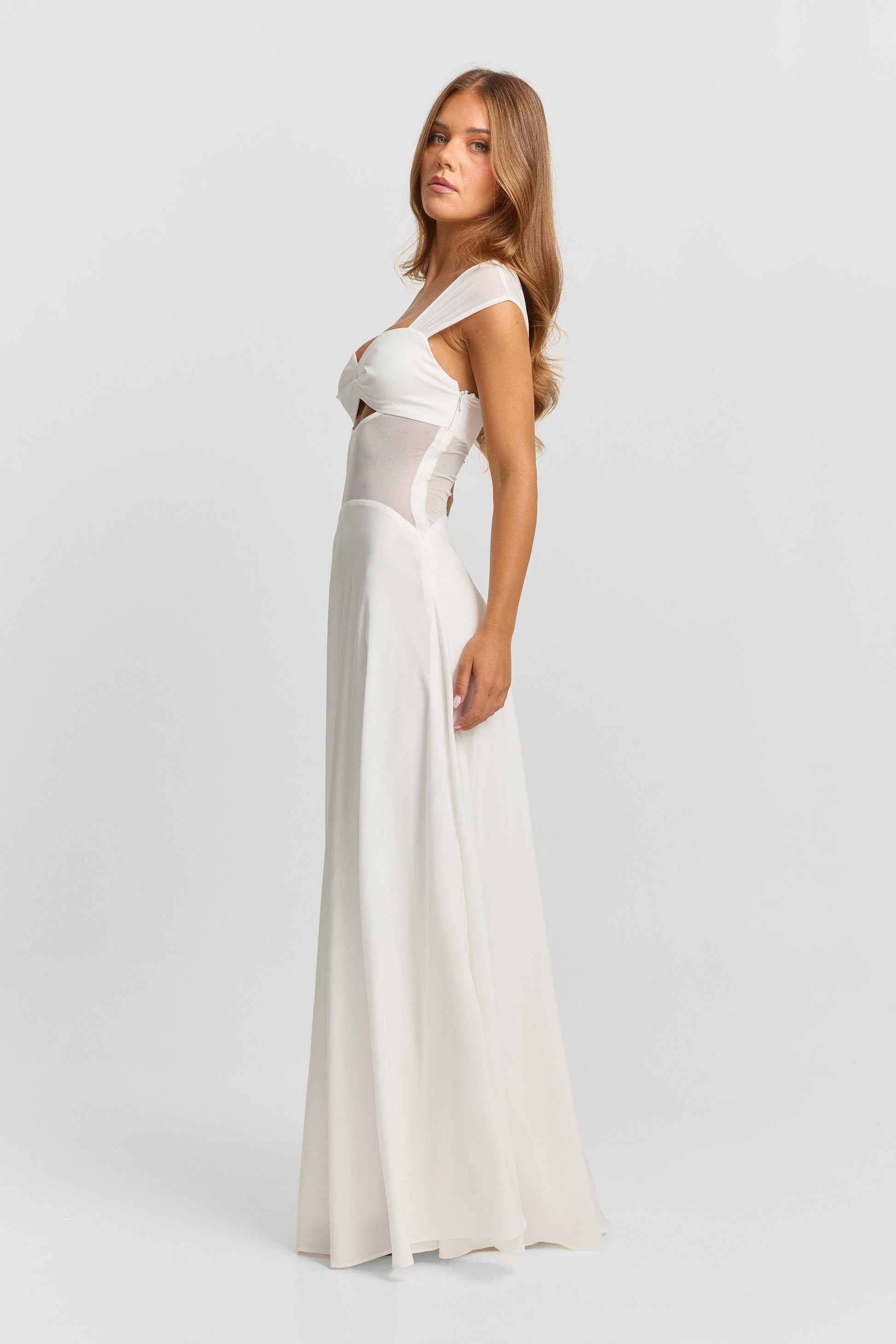 Ethereal and elegant, the Anastasia Maxi Dress is a vision of modern romance. Designed with delicate cap sleeves and a gently shaped bust, it features a subtle front cut-out and sheer mesh panel through the waist, offering a flattering silhouette with a touch of allure.