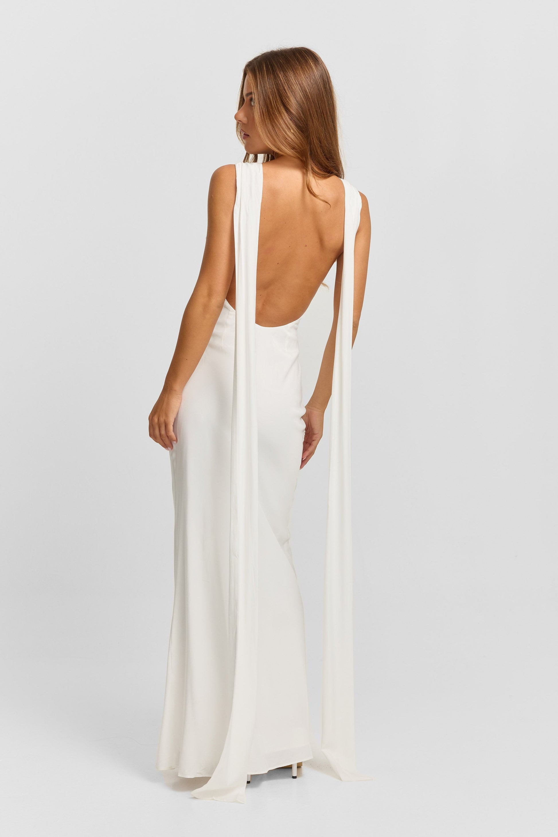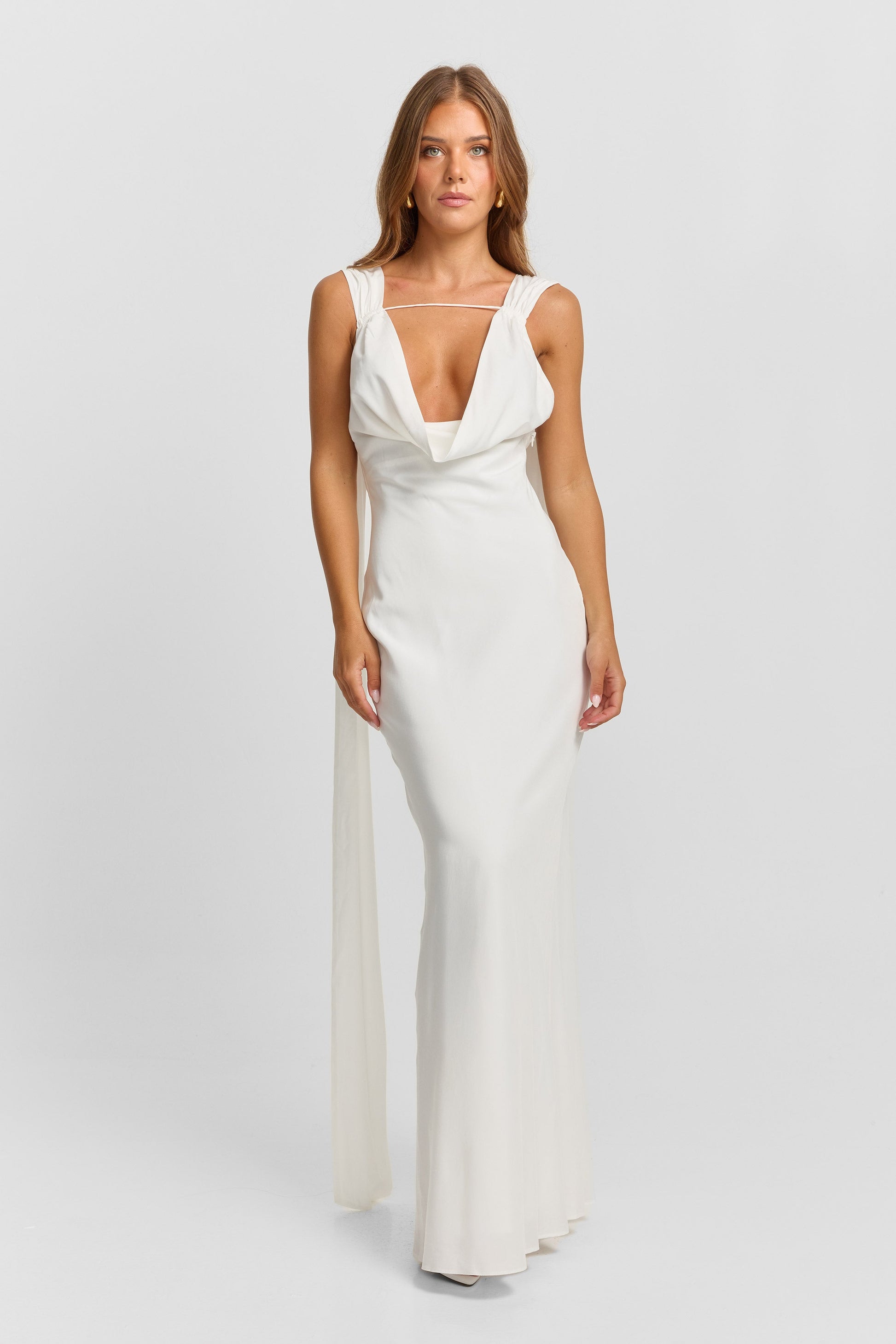 A modern silhouette with timeless elegance, the Eloise Maxi Dress exudes understated glamour. Crafted from a soft, flowing voile fabric, this floor-length gown features a graceful cowl neckline that drapes into a flattering bodice, complemented by a delicate strap detail across the collarbone for added refinement.