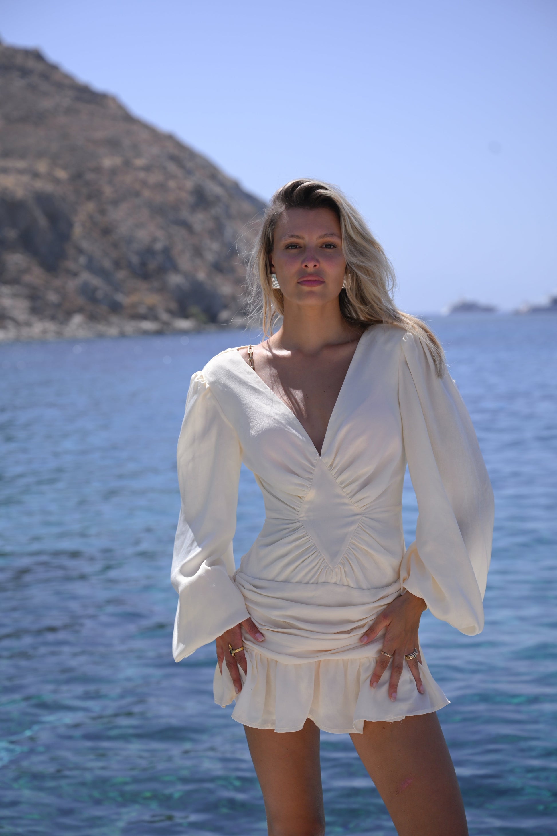 The Evie Mini Dress in Ivory is designed for unforgettable moments. Romantic, playful, and effortlessly chic—this stunning ivory mini dress with ballooned sleeves and ruched details is your go-to for making a feminine statement at celebrations, events, or special occasions.