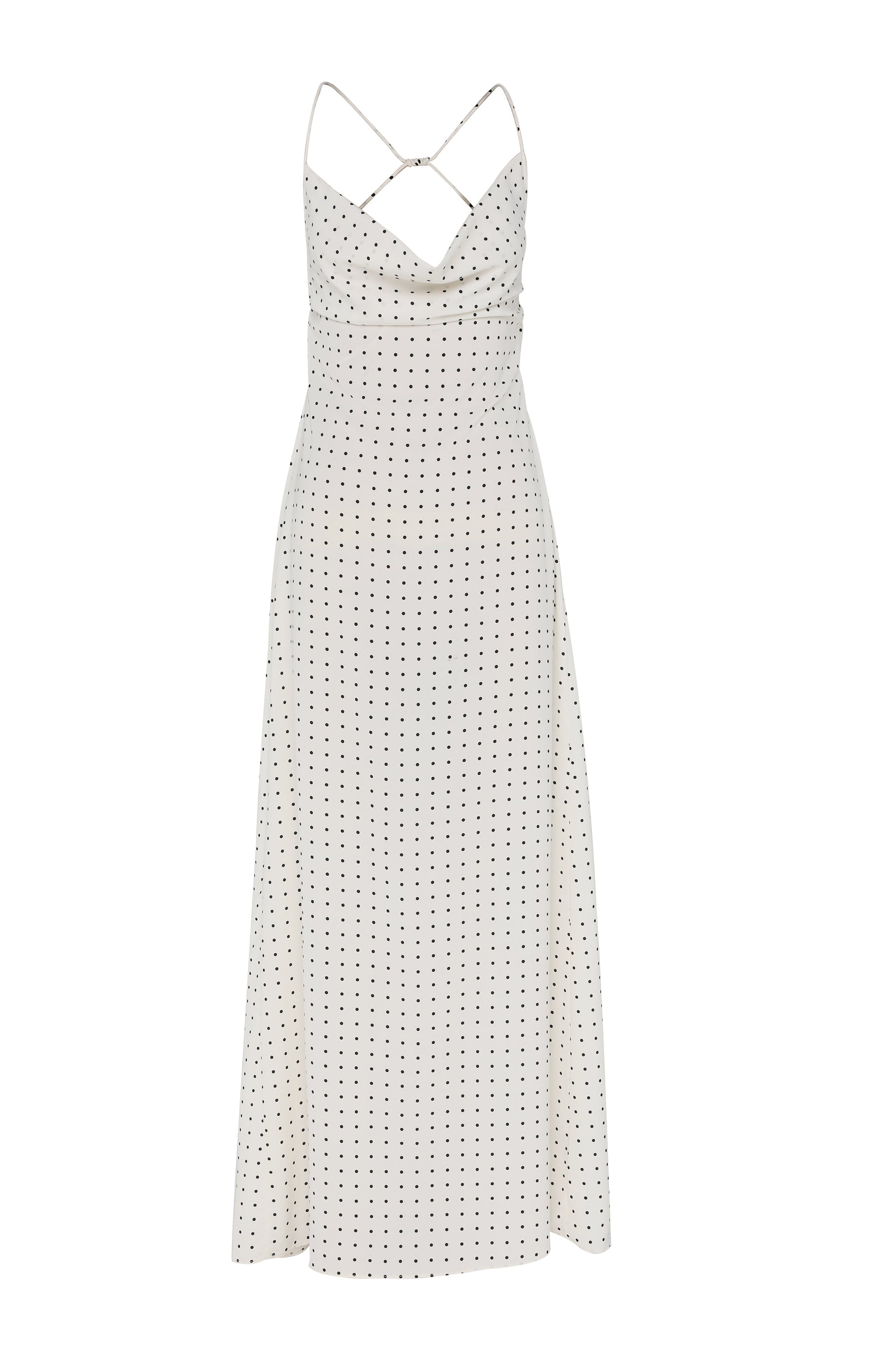 A playful yet timeless silhouette, the Lottie Maxi Dress is designed in a soft ivory base scattered with classic black polka dots. Featuring a flattering soft cowl neckline, delicate thin straps that intertwine at the centre back, and a low open back, this piece radiates understated elegance with a flirty twist.