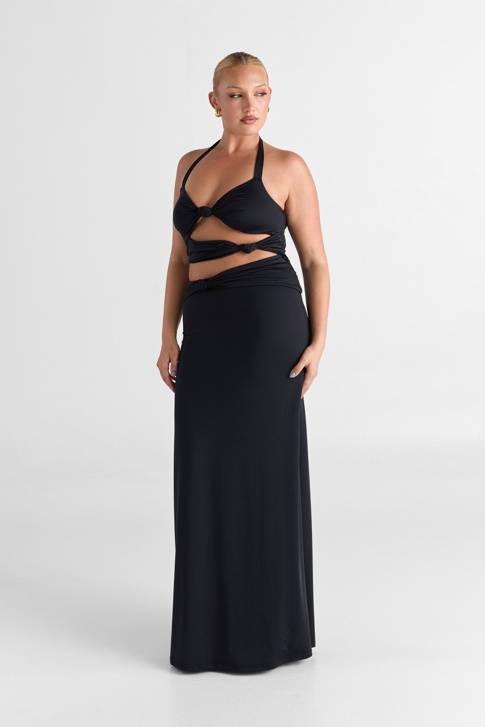 The Oralia Dress in Black brings sleek seduction to the spotlight. Featuring a bold halter neckline and a twist-front bust, this design sculpts your upper silhouette while drawing eyes to the décolleté. Modern waist cutouts and a fluid full-length skirt create a dramatic yet elegant contrast—perfect for making an entrance.