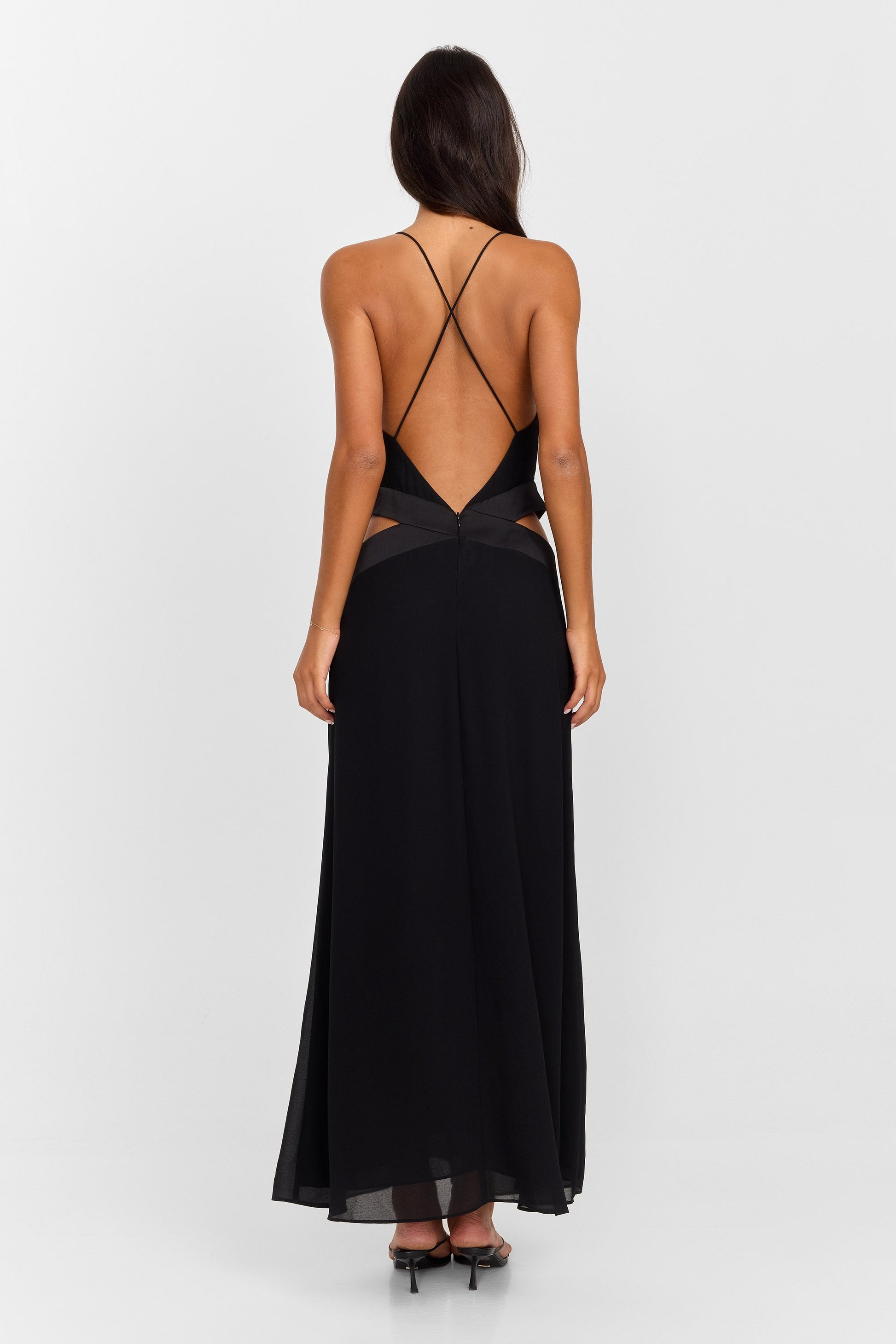 Make an unforgettable entrance in the Sia Maxi Dress. Crafted from soft chiffon and designed with a plunging neckline, this floor-length silhouette features a crossover satin waistband and sultry cut-out sides. A low open back with delicate crossover straps adds an elegant yet daring touch. The straps are fixed and not adjustable.