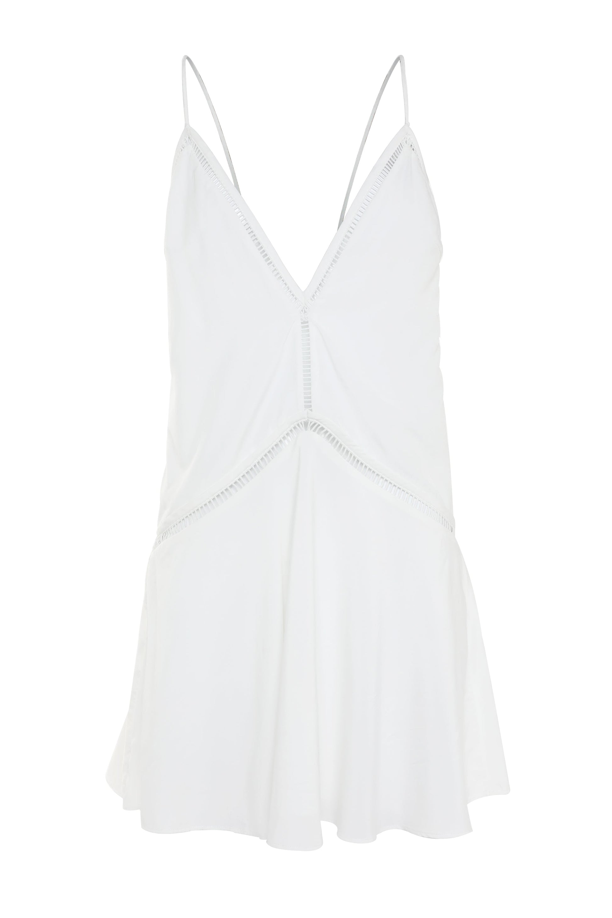 The Tansy Mini Dress is designed to flatter with a romantic touch. Crafted from a fluid, voile fabric, it features delicate ladder lace trims that trace the plunging neckline and waistline, offering a subtle hint of skin. The low open back is framed by criss-cross straps, adding a delicate touch and graceful movement.